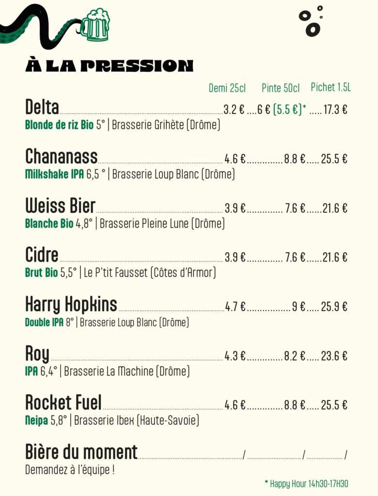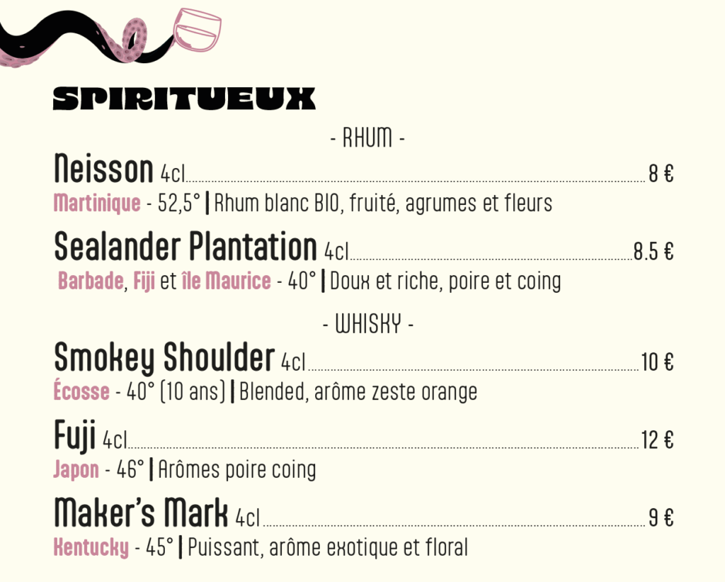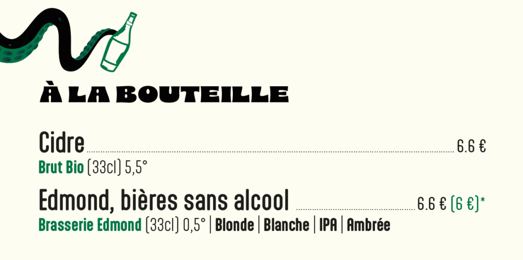 3.4 € (25cl) – 6.5 € (50cl ) – 18.7 € (1L )